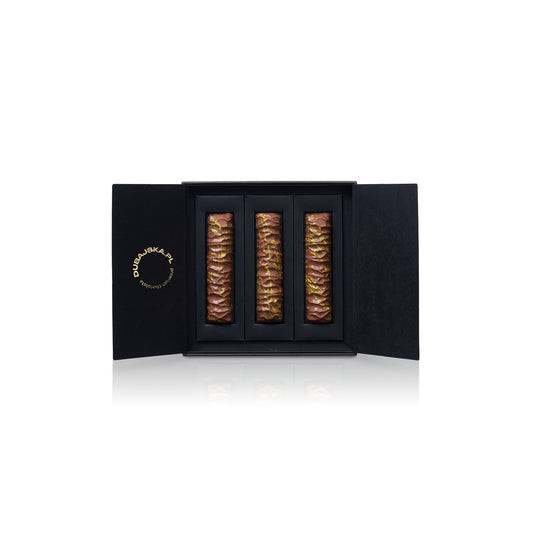 Wszystkie nasze produkty są tworzone rzemieślniczo, bez oleju palmowego, z luksusowej czekolady mlecznej Valrhona oraz pasty o wysokiej zawartości pistacji i pieczonego ciasta kataifi.