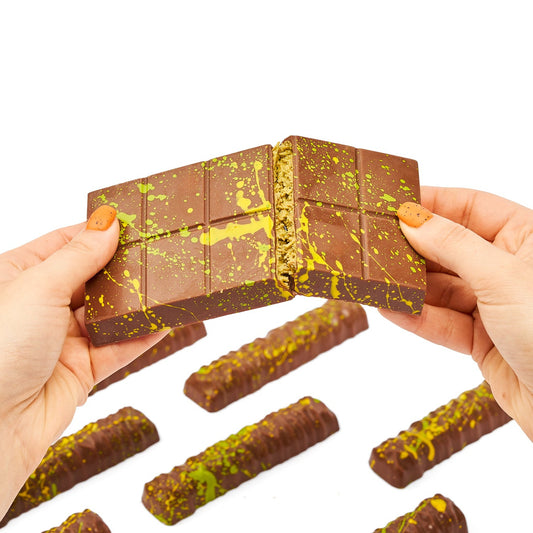 Wszystkie nasze produkty są tworzone rzemieślniczo, bez oleju palmowego, z luksusowej czekolady mlecznej Valrhona oraz pasty o wysokiej zawartości pistacji i pieczonego ciasta kataifi.