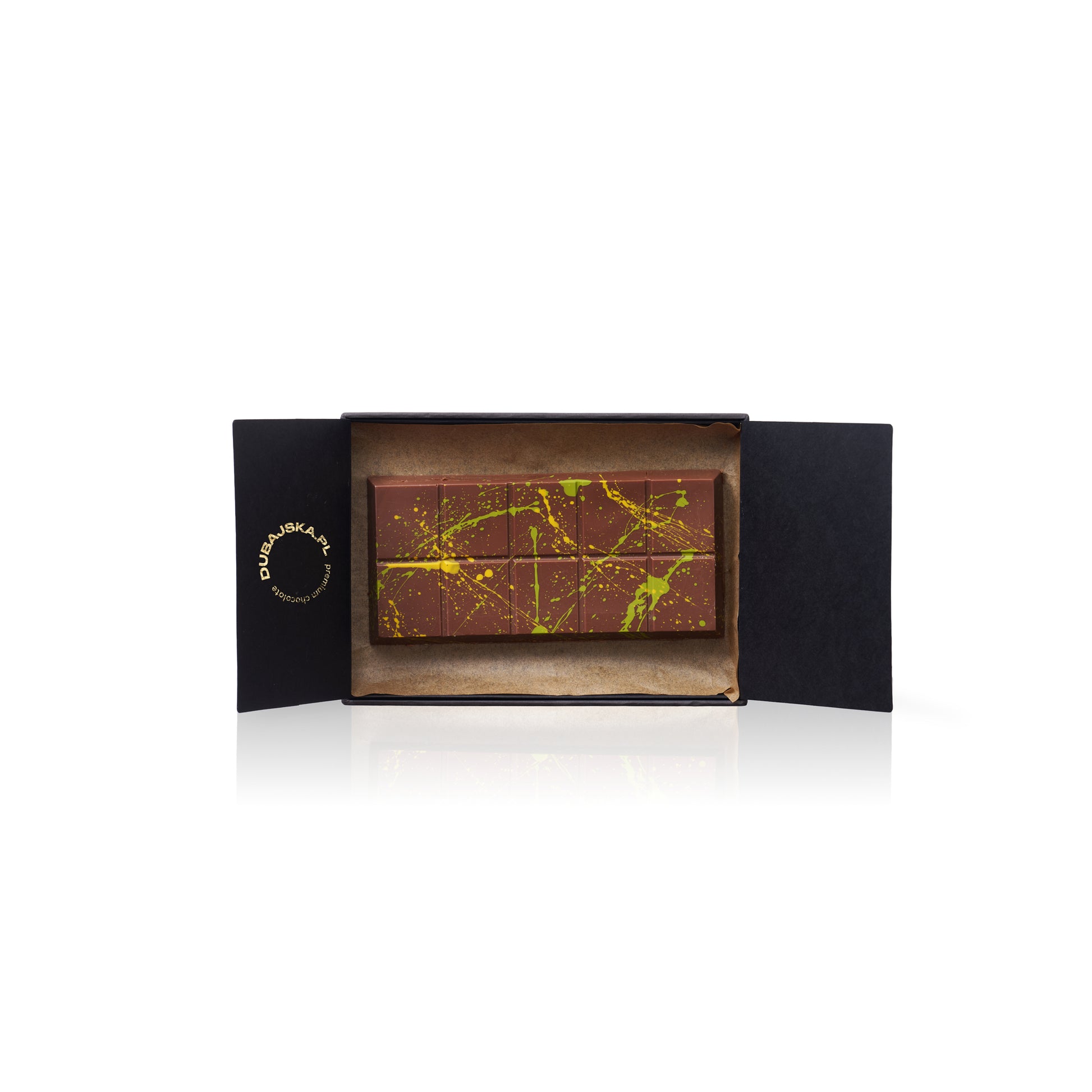 Odkryj intensywny smak naszego autorskiego nadzienia dubajskiego na bazie pasty o wysokiej zawartości pistacji, otoczonego najwyższej jakości francuską czekoladą premium Valhrona, zamkniętego w zdobionej tabliczce 180g.